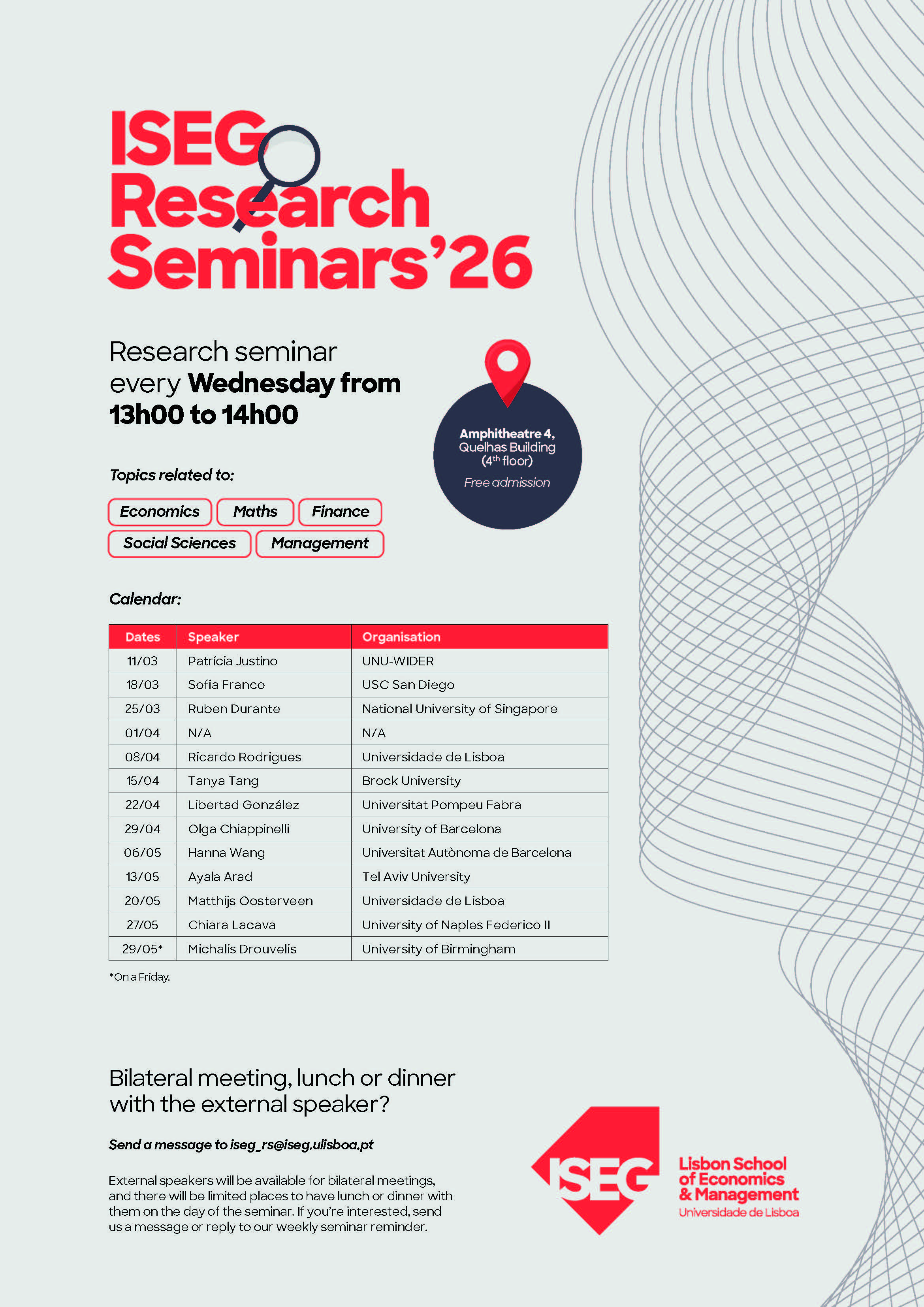 Os seminários de investigação do 2º semestre do ano letivo de 2025/26 decorrem de 11 de março a 29 de maio de 2026, às quartas-feiras, das 13h00 às 14h00, no Anfiteatro 4 (Edifício Quelhas, 4º Piso).