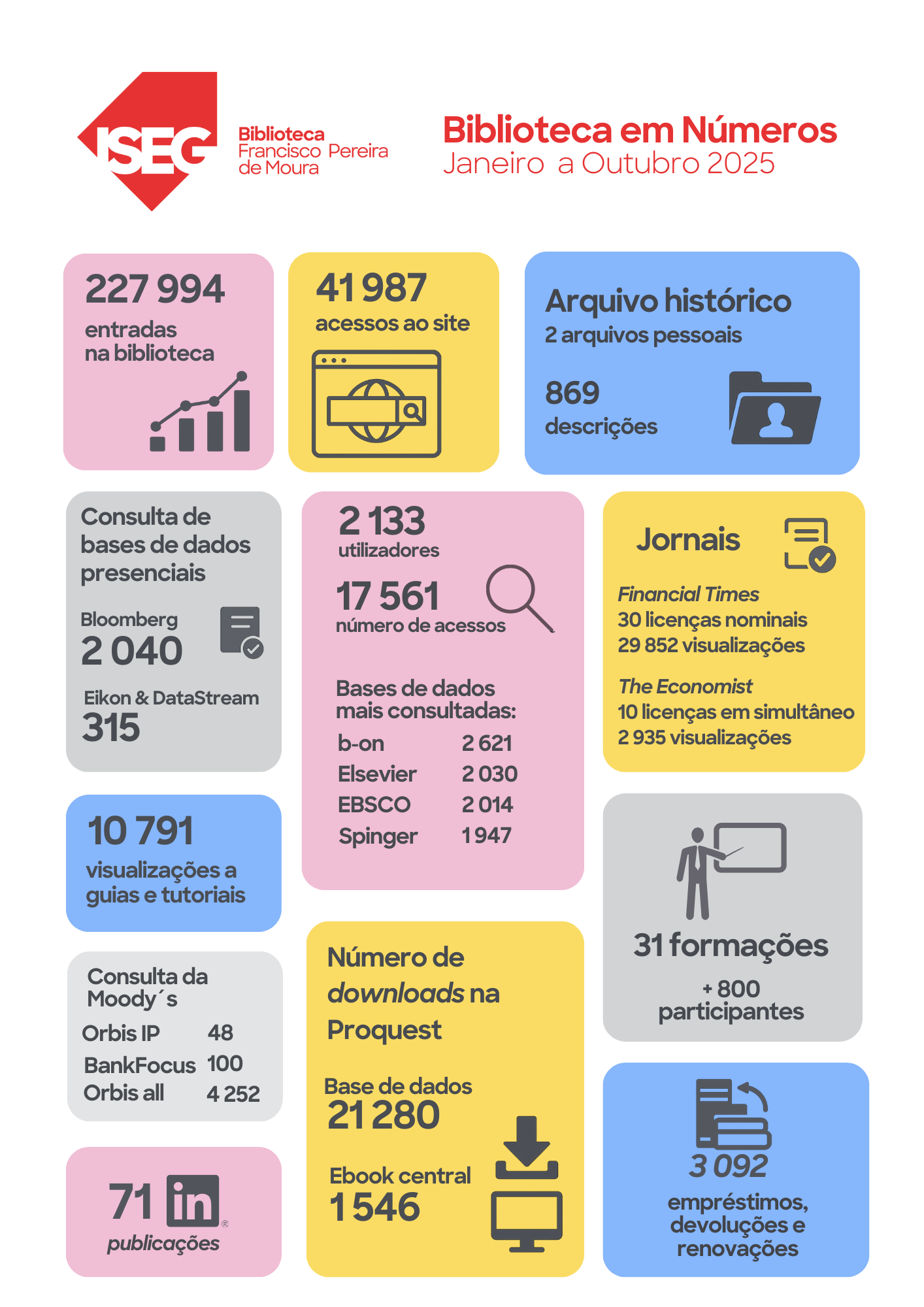 Here we present the main quarterly and annual data of the ISEG Library. These numbers show the usage of our services, resources, and spaces, allowing us to track their evolution over time.