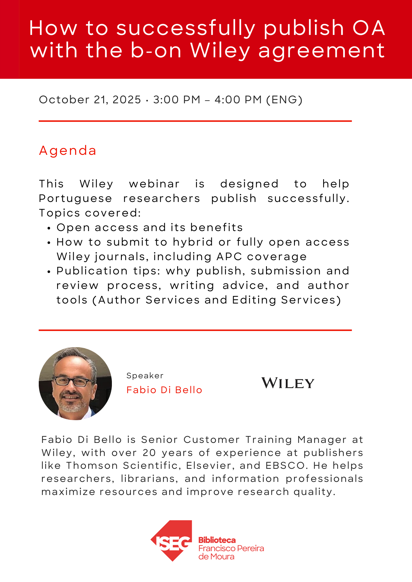 21/10/2025, 15H00-16H00 | How to successfully publish OA with the b-on Wiley agreement (ENG) | Online | Inscrição | Agenda |