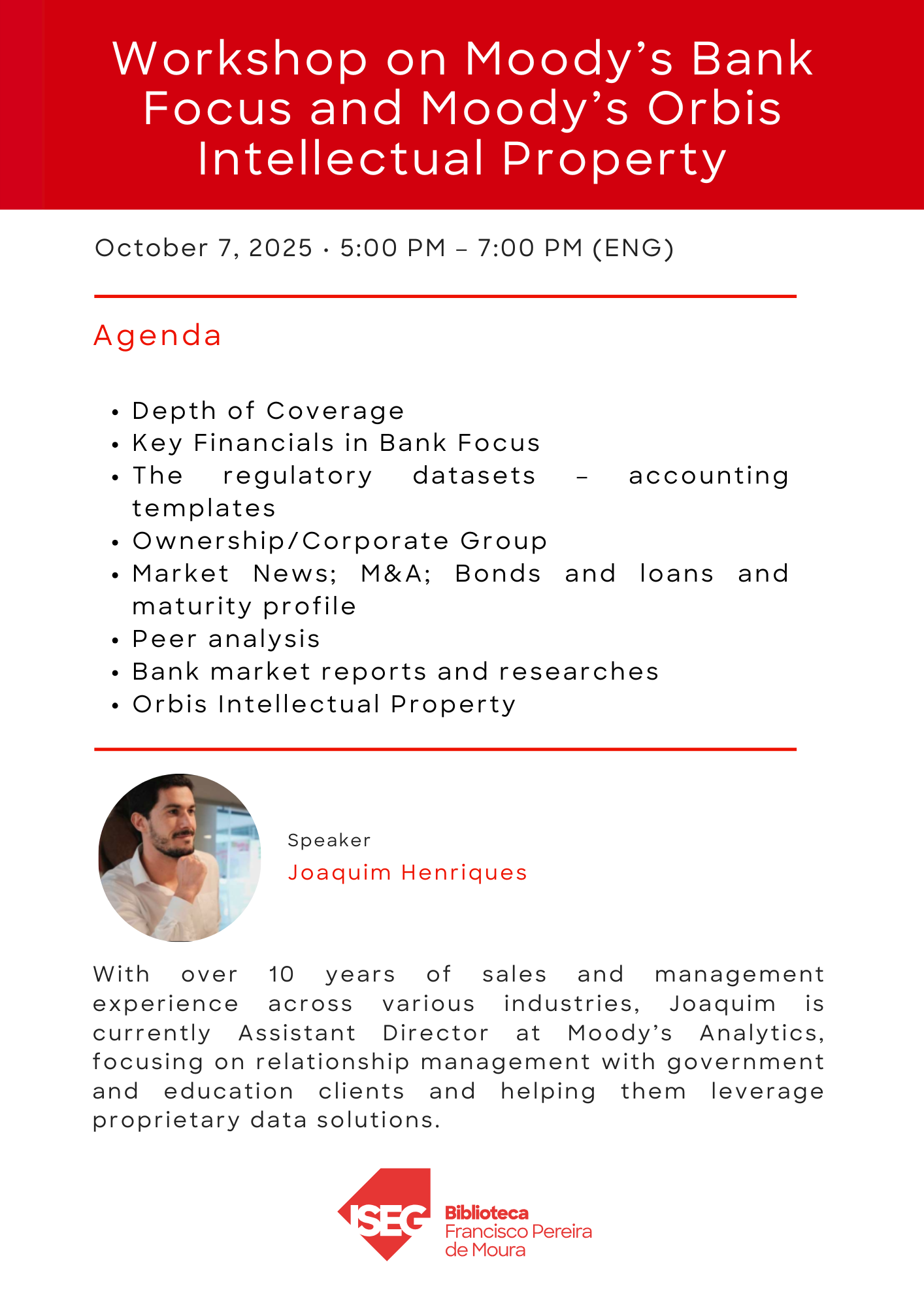 7/10/2025, 17H00-19H00 | Workshop on Moody’s Bank Focus and Moody’s Orbis Intellectual Property (ENG) | Online | Clique para participar | Agenda |