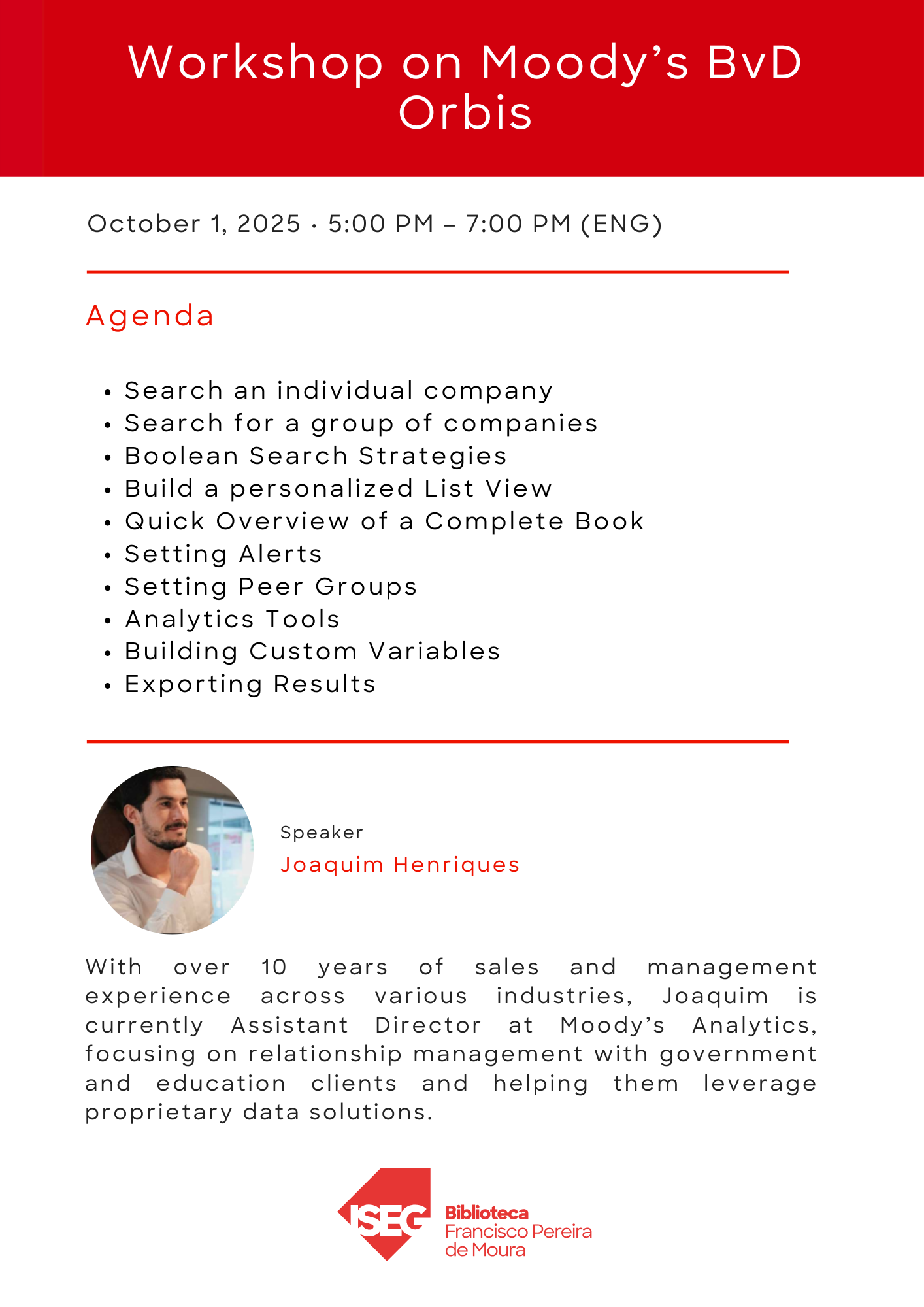 1/10/2025, 17H00-19H00 | Workshop on Moody’s BvD Orbis (ENG) | Online | Clique para participar | Agenda |