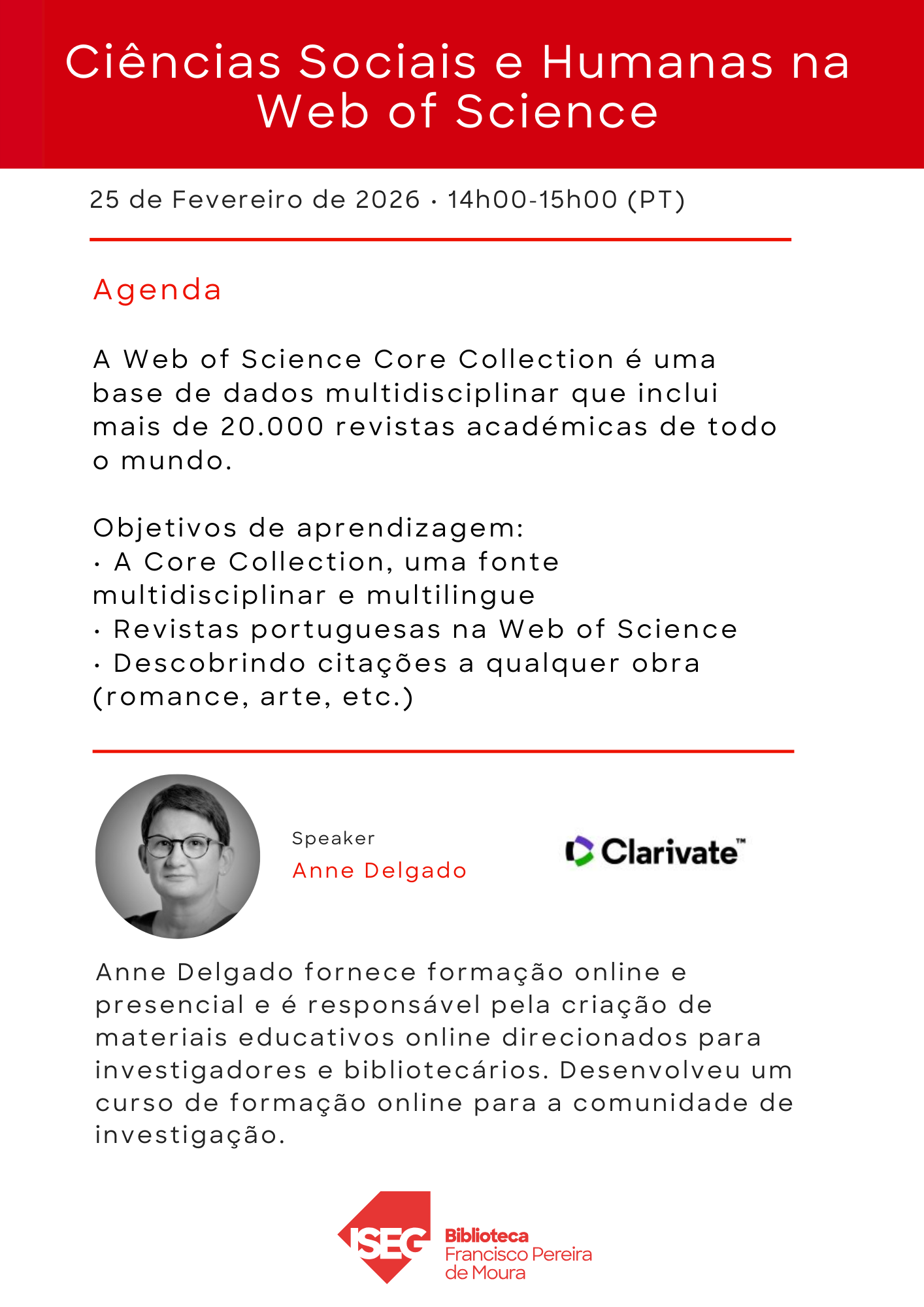 Formação a pedido – destina-se a utilizadores internos (podem ser solicitadas por alunos, docentes e investigadores) do ISEG e pretende promover a otimização dos recursos eletrónicos subscritos pelo ISEG. Decorre em sessões com duração e número de participantes variável. Para solicitar estas sessões envie e-mail para formacaobib@iseg.ulisboa.pt.