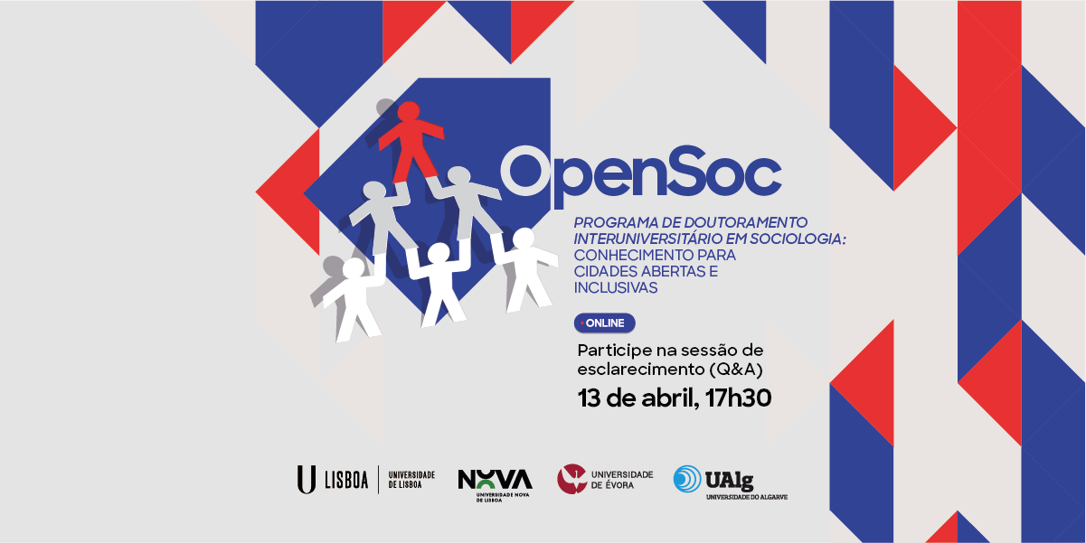 The OpenSoc degree is the result of an inter-university collaboration in the areas of sociological research, involving Universidade de Lisboa via the School of Social Sciences (ICS), the School of Social and Political Sciences (ICS), the School of Social and Political Sciences (ISCSP), Lisbon School of Economics and Management (ISEG); Universidade Nova de Lisboa via the Faculty of Social Sciences and Humanities; Universidade de Évora via the School of Research and Advanced Training; and Universidade do Algarve via the Faculty of Economics.