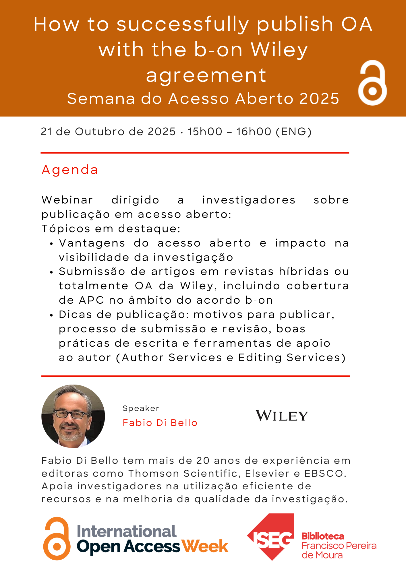 21 de outubro de 2025 15.00-16.00 Online | Sessão de formação | How to successfully publish OA with the b-on Wiley agreement Agenda Registration |