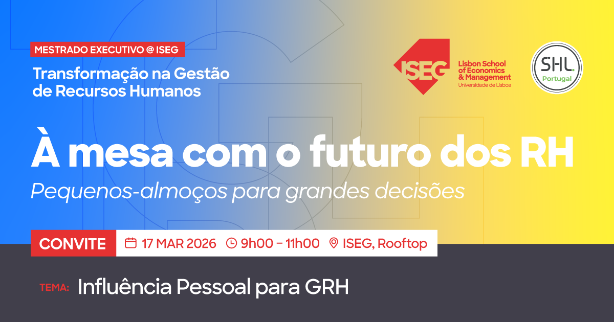 As part of the ISEG Executive Master's Degree in Human Resources Management Transformation, developed in partnership with SHL Portugal, will take place on the March 17th, from 9:00 a.m. and 11:30 a.m., in the ISEG Rooftop, a breakfast dedicated to the theme “Personal Influence for HRM”.