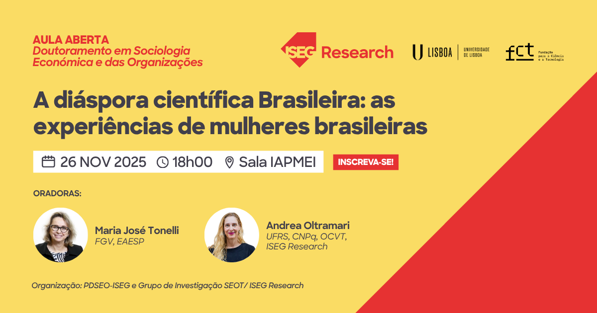No dia 26 de novembro, realiza-se uma Aula Aberta sobre “Aula Aberta | A diáspora científica Brasileira: As Experiências de Mulheres Brasileiras“, no âmbito da unidade curricular “Organizações e Trabalho” do Doutoramento em Sociologia Económica e das Organizações do ISEG (PDSEO).