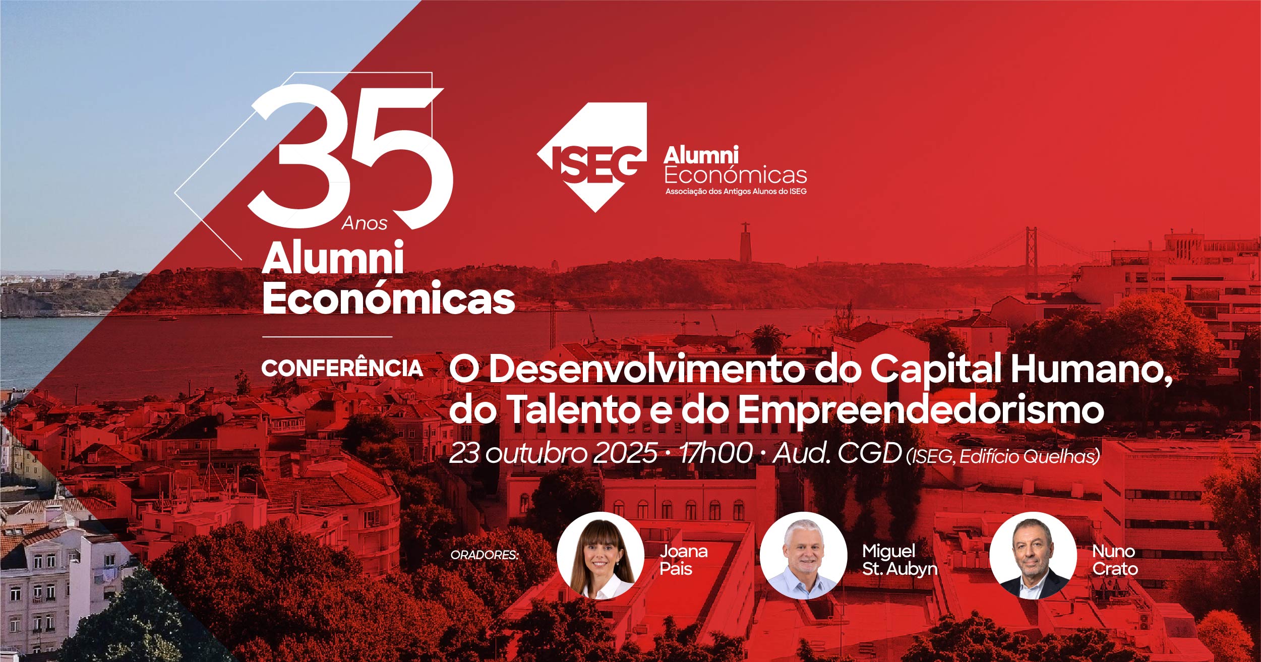 No âmbito das comemorações do 35º aniversário da ISEG Alumni Económicas, temos o prazer de o/a convidar para a conferência “O Desenvolvimento do Capital Humano, do Talento e do Empreendedorismo”, integrada no Ciclo de Conferências “Para onde vão o Mundo, a Europa e Portugal?.